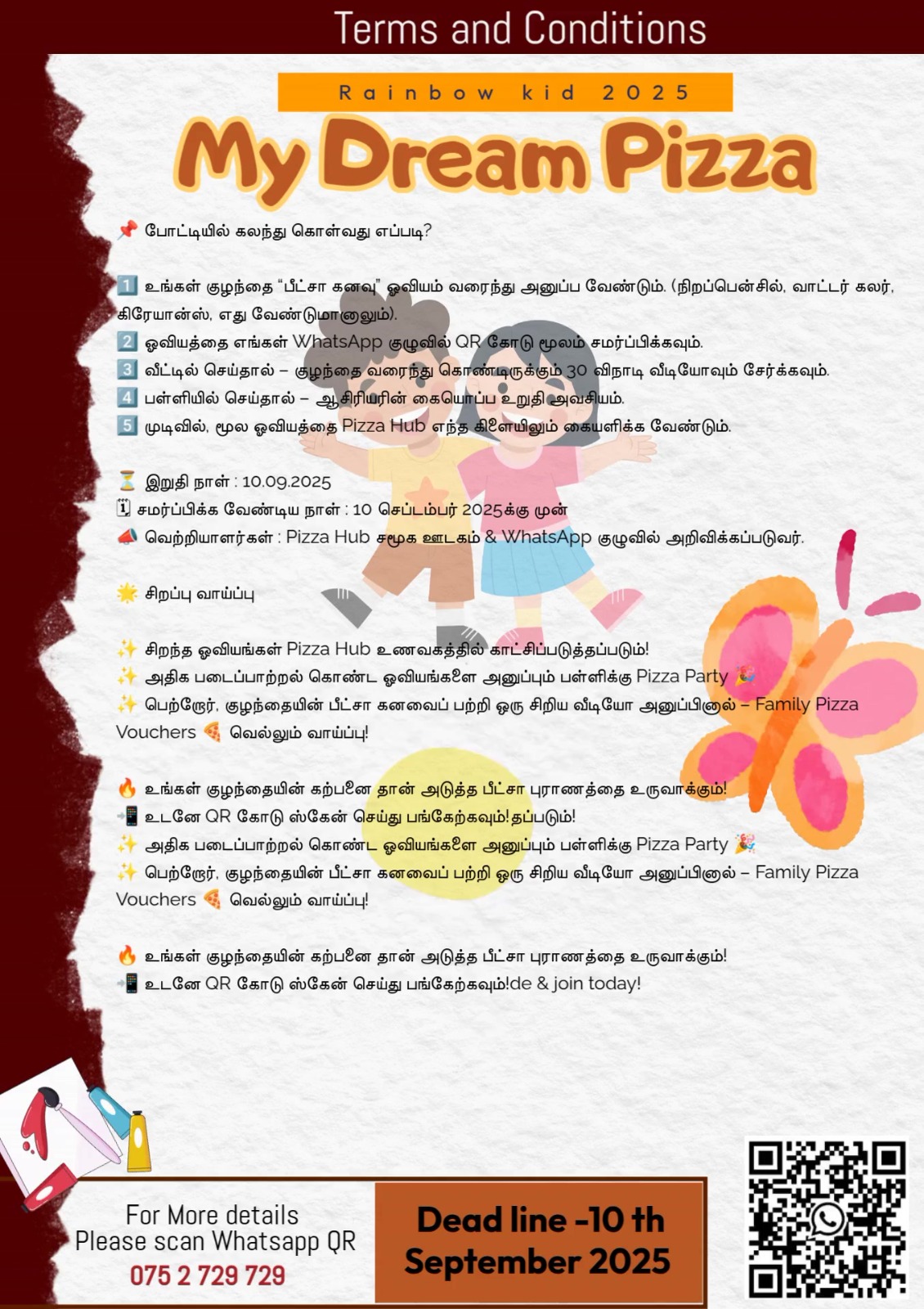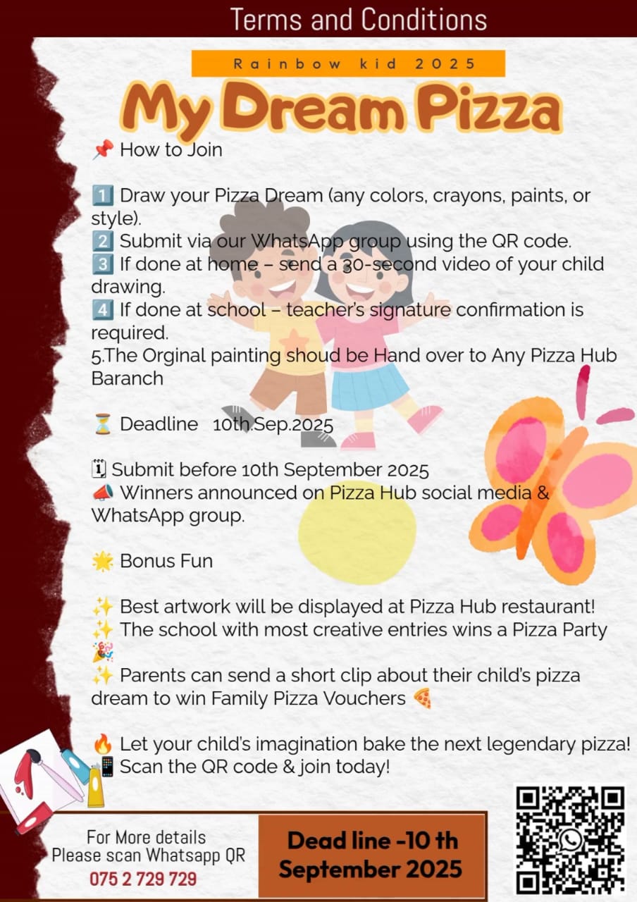 Show Sri Lanka your child’s My Dream Pizza art. Winners get cash prizes, free pizza vouchers, certificates, and features at PizzaHub.